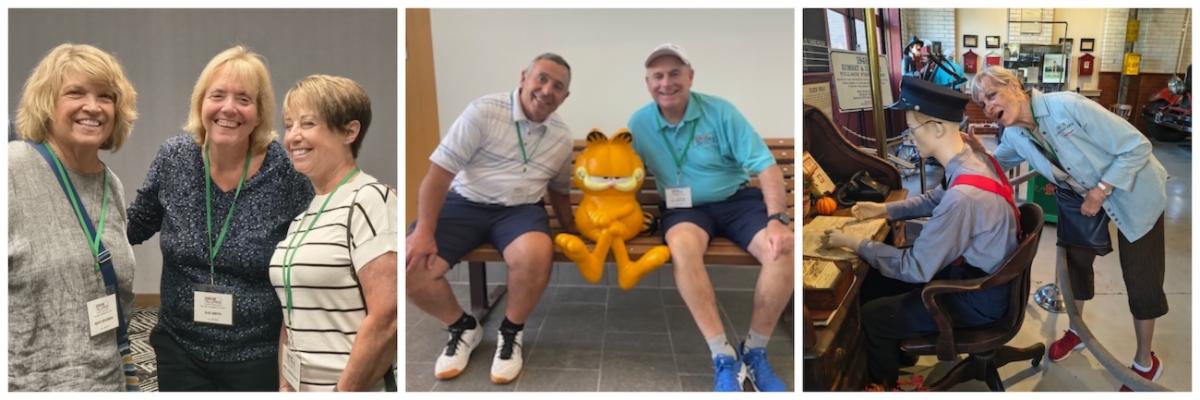 Chambers Chapter members enjoyed a few fall days in Columbus, OH including visits to the Billy Ireland Cartoon Library and Museum, the Franklin Park Conservatory and Botanical Garden and the Budd Dairy Hall. Photos L-R: Mary Moomaw, Sue Smith and Cindy Koenig-Daggs; Tony Delisio and chapter guest Phill Morgan, YMCA Alumni President, have a cat-chat with Garfield, while Connie Clark gives a telegraph operator an earful.