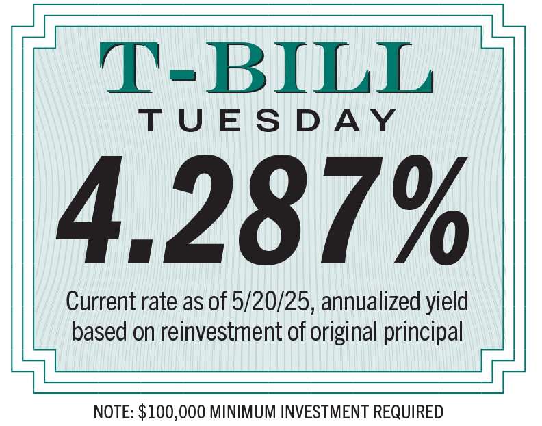 | | | Have cash or cash equivalents earning nothing or next-to nothing? It's a great time to invest in U.S. Treasury Bills, a short-term investment with little risk and easy liquidity. We'll post current rates of return here each Tuesday. Want to put your money to work? Call a Miramontes Capital advisor today! | | |
