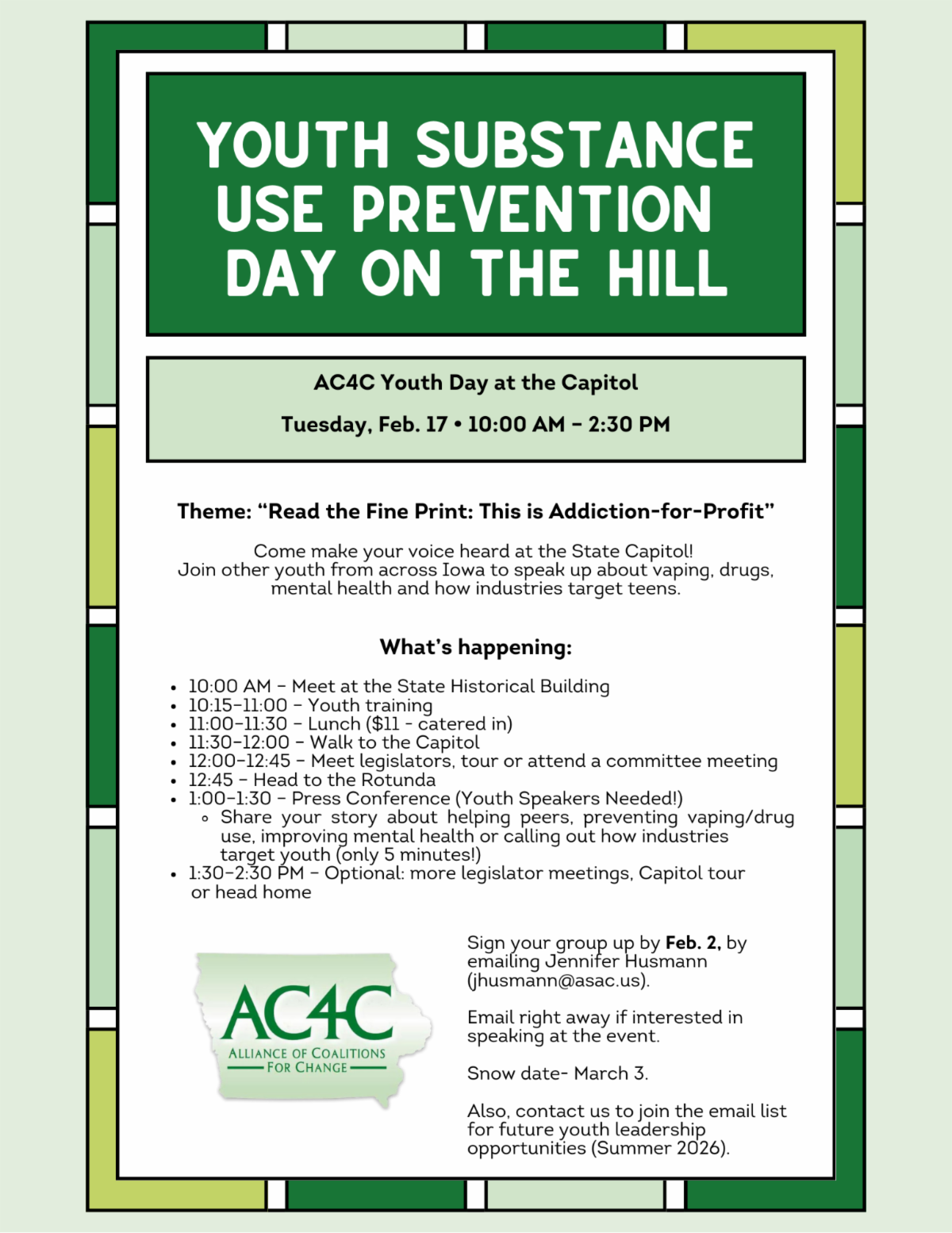 Hope for good weather this year! Snow date is set for March 3. HERE is a link to the Day on the Hill toolkit to help prepare your group!