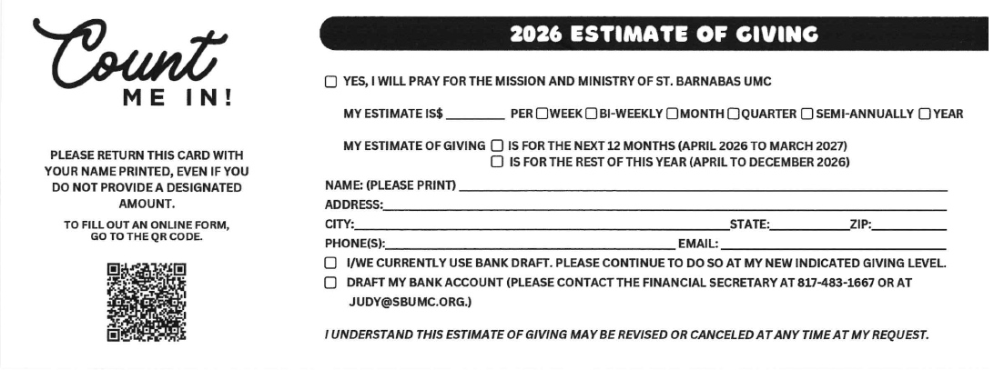 This is just a friendly reminder that if you haven't filled out your estimate of giving card, please take a minute to make it happen! It is really helpful in our budgeting process to get all the cards soon. You can mail it in, fill one out digitally, drop it by the church office or bring it to worship and place it in the offering plate. Thanks so much! | |