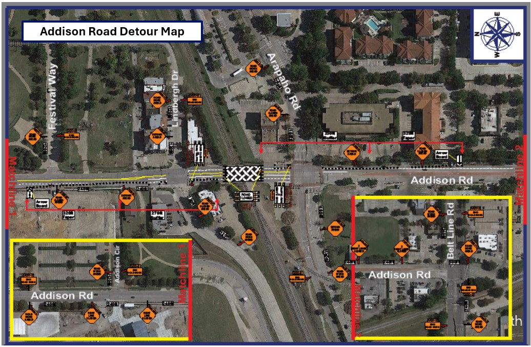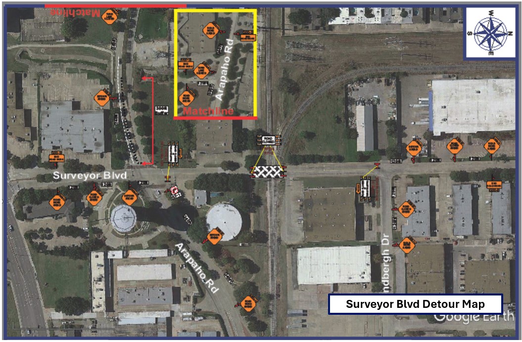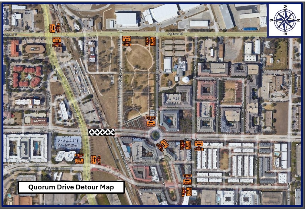 As part of the DART Silver Line construction, DART has scheduled full lane closures on Quorum Drive, Surveyor Boulevard, and Addison Road next week from 7am - 7pm.