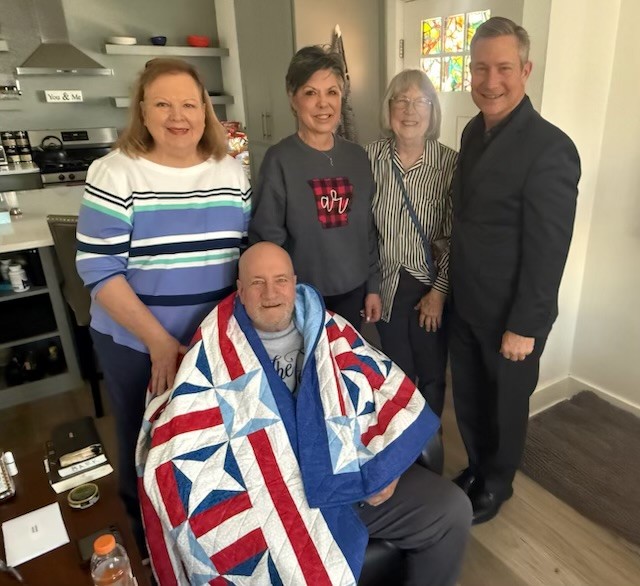 Rollin Barkley, one of our Quilt of Valor recipients was unable to be in church on Veterans Day last November when we recognized members of our congregation who served prior to the end of the Vietnam war. Every time we scheduled a time to deliver it to him unavoidable events occurred - including snow and ice. Finally we were able to make the presentation last Wednesday. We honor him for his 12 years of service in the US Navy as a Ship Fitter Fireman. He served in the Vietnam and Libyan War Theaters. Making the presentation were Pastor Wes Hilliard, and Heritage Quilter representatives Terry Freeman and Sue Weege. Joining them were his wife, Tyna, and Bob Freeman, representing our congregation. Rollin, we salute and thank you!