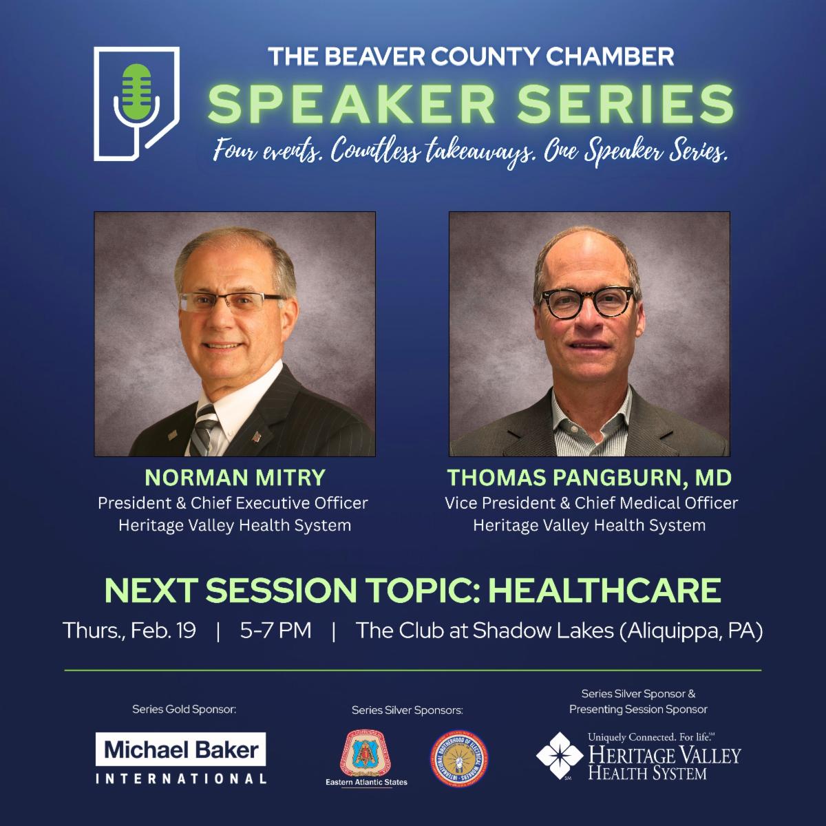 The Beaver County Chamber of Commerce Speaker Series presents an upcoming session focused on healthcare. Norm Mitry, President & Chief Executive Officer, and Thomas Pangburn, MD, Vice President & Chief Medical Officer, of Heritage Valley Health System will be featured in the session, which will take place on Thursday, February 19, from 5 – 7 pm at The Club at Shadow Lakes in Aliquippa. The cost is $60 per person, which includes hors d’oeuvres and two drink tickets. The session will provide an opportunity for business and community leaders to learn about the opportunities and challenges shaping care delivery across Beaver County. For additional details or to register, please click here to visit the Beaver County Chamber of Commerce website.