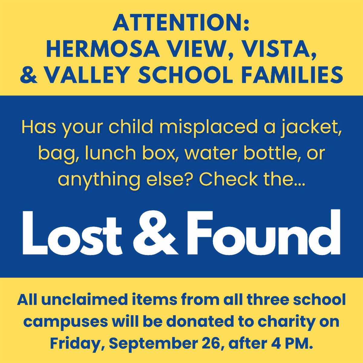 9/26 (After 4 PM): HBCSD: HVS Lost & Found - All unclaimed items at Hermosa View, Vista, & Valley will be donated to charity