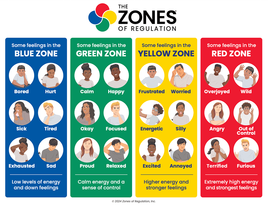 Kindergarten-1st Grade: Students receive weekly lessons, which allows us to dive deeper into each zone. Together, we explore practical tools and strategies students can use to return to the Green Zone—a state where they are focused, calm, and ready to learn.