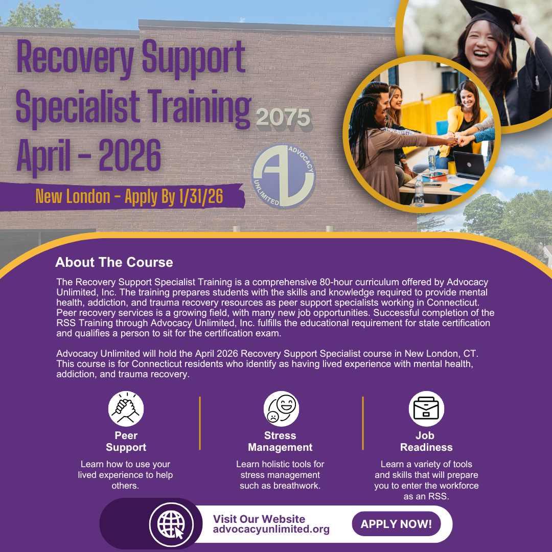 Applications for our April 2026 Recovery Support Specialist Course open on November 1, 2025. The application deadline is January 31st, 2026. This course will be held in New London, CT.