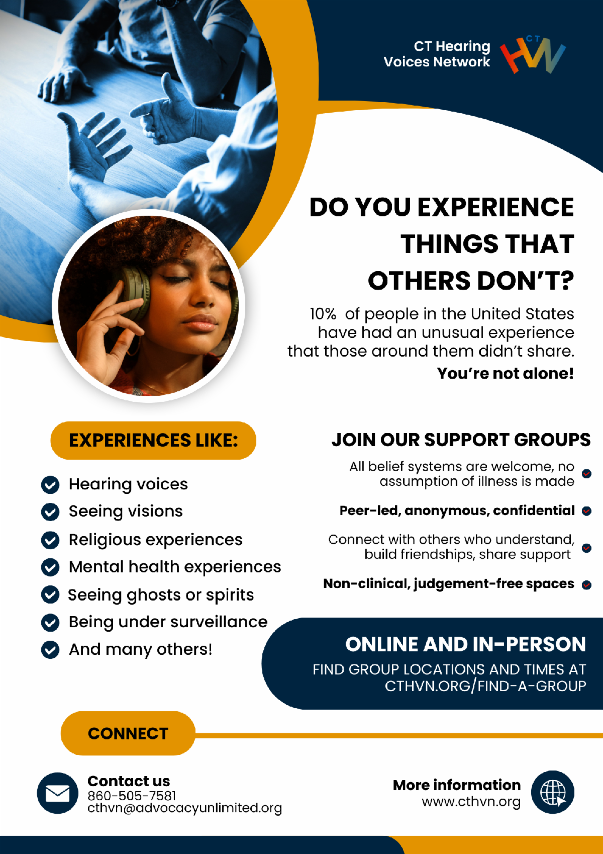 The CT Hearing Voices Network provides statewide support for people who hear voices or have other alternative experiences. CTHVN group times can be subject to change throughout the month. Updated times and dates can be found on the CTHVN website, including: