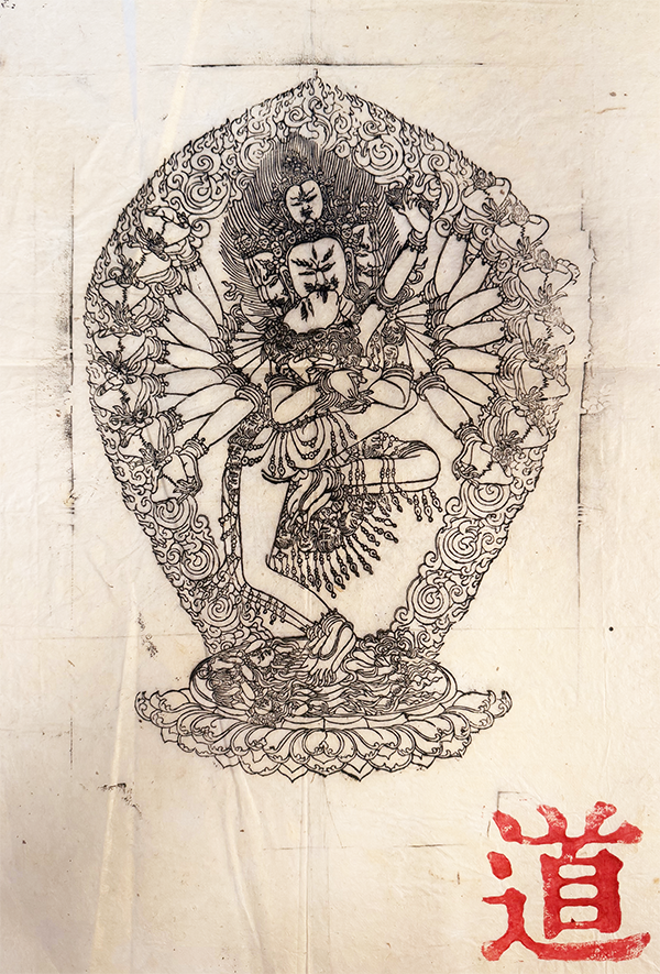 The red stamp at the bottom of the print typically serves as an authenticating seal, artist’s mark, or collector’s impression. These stamps are often applied in red cinnabar ink and carry cultural, spiritual, and artistic significance. The stamp on this print is the single Chinese character, "Dao," meaning The Way or The Path, representing the universal principle or natural order of existence. It may have been added by the artist or studio to evoke a connection with Buddhist ideals.