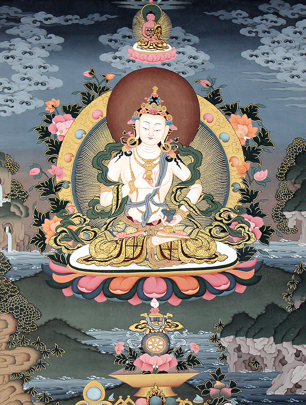 Vajrasattva (Tibetan: Dorje Sempa) occupies a distinct and foundational position within the Vajrayana Buddhist hierarchy. He is regarded as an emanation or reflection of the Ati Buddha, manifesting the pure awareness and compassionate activity of the primordial Buddha in a more accessible and relational form—that of a bodhisattva. Unlike the Five Dhyani Buddhas of the next category, who represent specific wisdoms, Vajrasattva does not belong to that grouping. Instead, he is invoked in many practices to help purify negative karma and mental obscurations that obstruct spiritual realization. In this way, Vajrasattva serves as the primordial bodhisattva of purification and esoteric transmission.