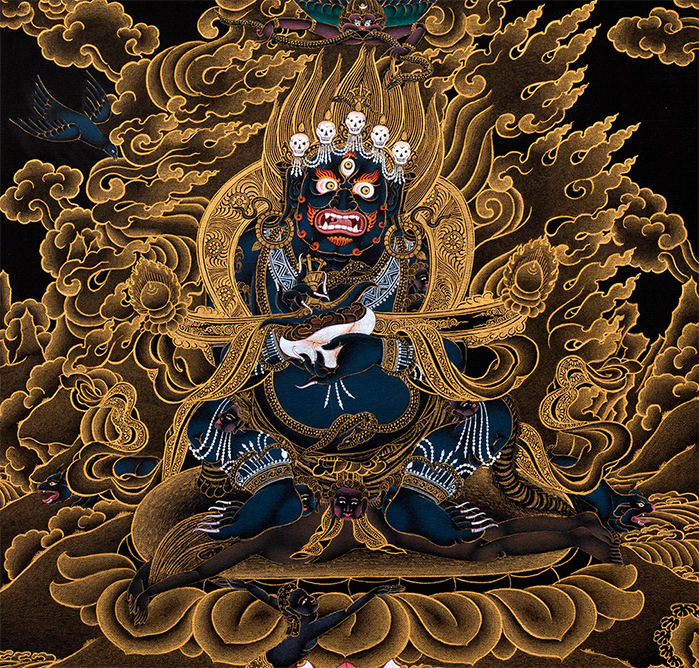 Dharma Protectors (dharmapāla) occupy a unique and vital role in the Vajrayana pantheon. These beings, often wrathful in appearance yet compassionate in nature, serve as guardians of the Buddhist teachings, its practitioners, and the sacred spaces. Their task is to protect not only the external environment but also the inner landscape of the practitioner's mind. They are invoked in rituals, visualizations and protector practices to remove hindrances, ensure the purity of spiritual lineages, and support the practitioner in their journey toward enlightenment. Despite their wrathful forms, Dharma Protectors are considered expressions of enlightened mind. Their fierce iconography—bulging eyes, snarling mouths, weapons, and adornments of bone and flame—is deeply symbolic. They trample demons not to annihilate beings, but to destroy ignorance, negative karma, and afflictive emotions.