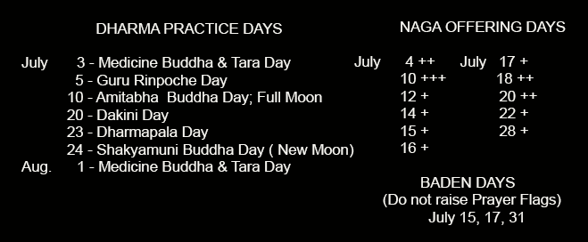 During the Tibetan 5th month, the Nagas are preparing for their summer season. If you make offerings to them on a Naga Offering (teb) day, in turn they will help you fulfill your wishes. If you make offerings to them on a negative (dok) day, your offering becomes poison, pus and blood and they will surely flee.