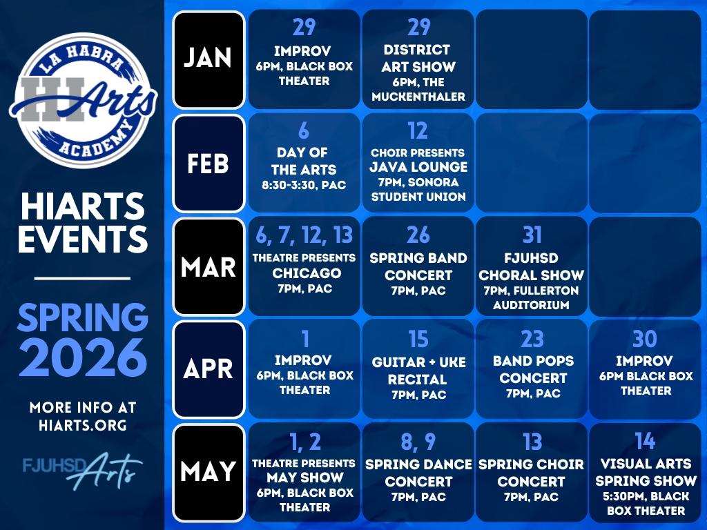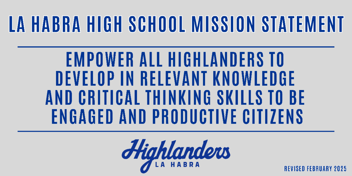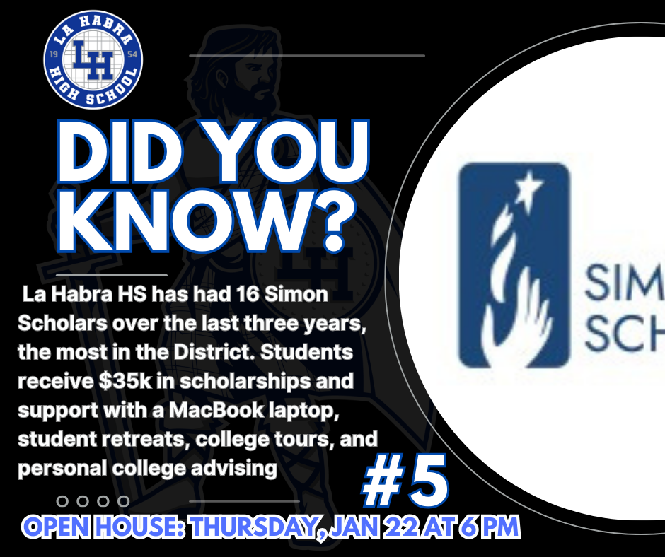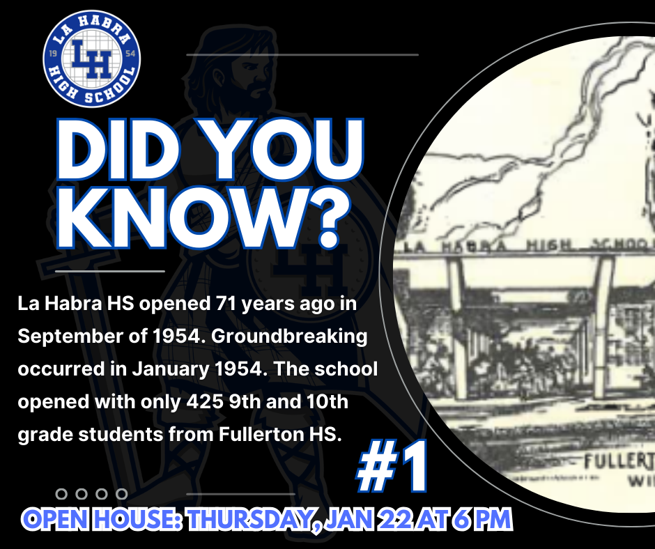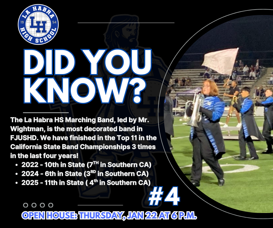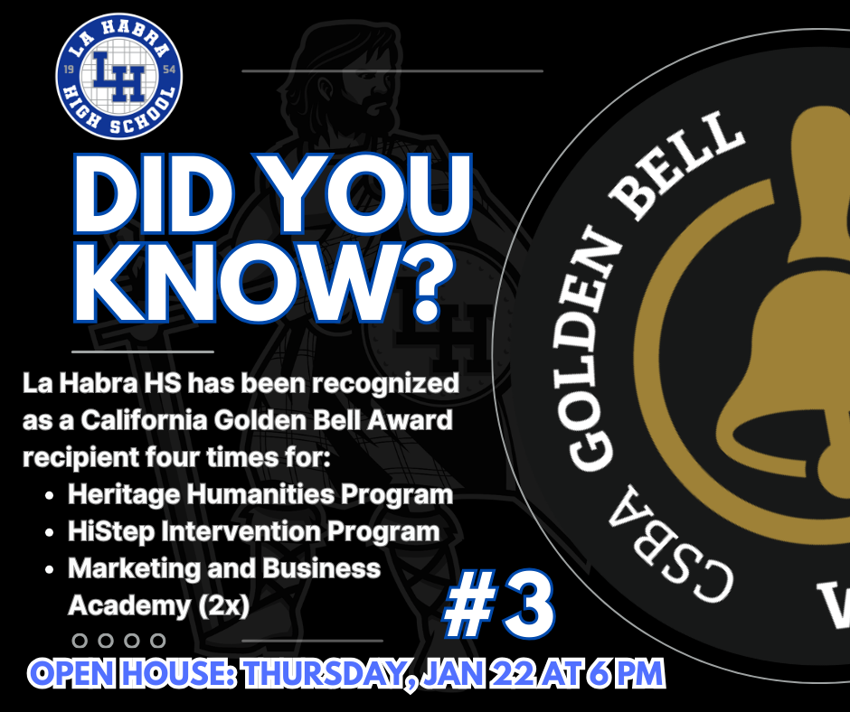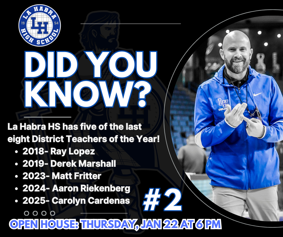 Finally, over the next few weeks, we will be sharing “Did You Know?” highlights about La Habra High School to showcase the great accomplishments of our students, staff, programs, and community over the past few years. These highlights will lead up to our Open House on Thursday, January 22, and we look forward to celebrating all that makes La Habra High School special.