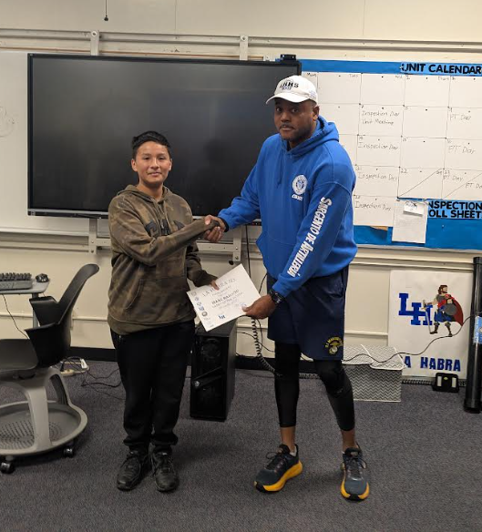 During the ceremony, Cadet Lieutenant Javier Martinez Santillan, our Unit Executive Officer, was presented with the prestigious Bronze Cross of Excellence from the Legion of Honor. The Legion of Honor is an illustrious society composed exclusively of combat veterans who have been awarded either the Medal of Honor or a Service Cross—the two highest awards for bravery in the United States Armed Forces. Each year, the Legion of Honor sponsors the Bronze Cross to recognize the top NJROTC cadet in each geographic region. This distinction means Cadet Martinez Santillan was selected as the best cadet among approximately thirty NJROTC units across Southern California.