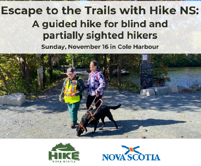 Join Hike NS in Cole Harbour on November 16 for a free guided hike for blind and partially sighted hikers and their guests, including bus transportation. It is supported by the NS Department of Communities, Culture, Tourism and Heritage.