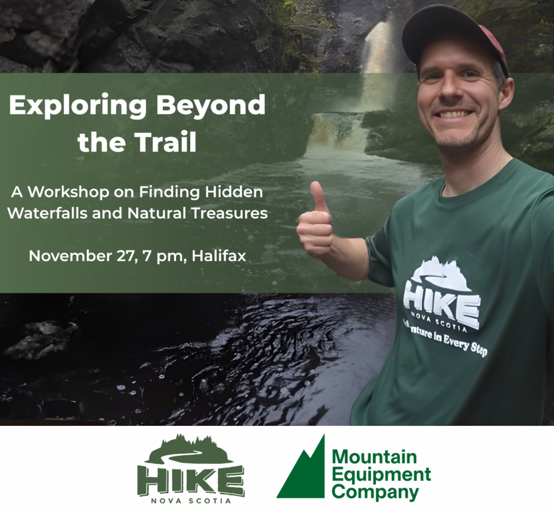 Taking place on November 27 at MEC Halifax, Hike Nova Scotia and Mountain Equipment Company will host a talk by Benoit Lalonde, Exploring Beyond the Trail: A Workshop on Finding Hidden Waterfalls and Natural Treasures. It is supported by the NS Department of Communities, Culture, Tourism and Heritage and Mountain Equipment Company. This is a free event but registration is required here.