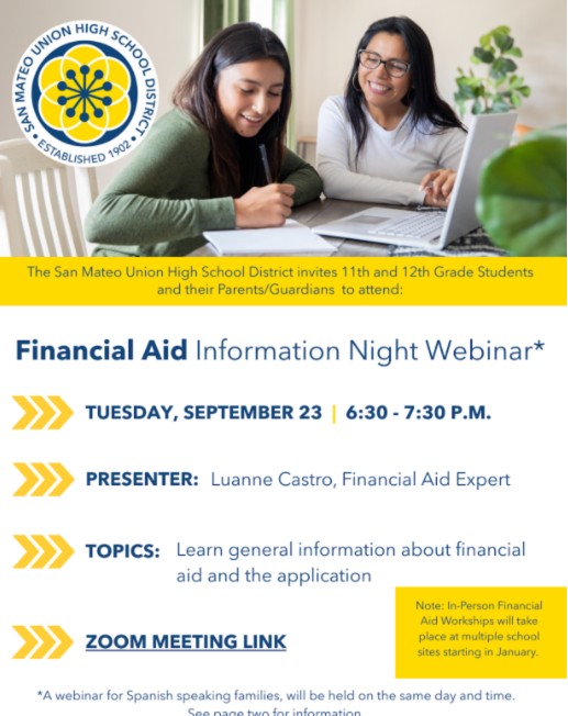 Tues Sept 23 @ 6:30pm: Districtwide Financial Aid Webinar English Spanish