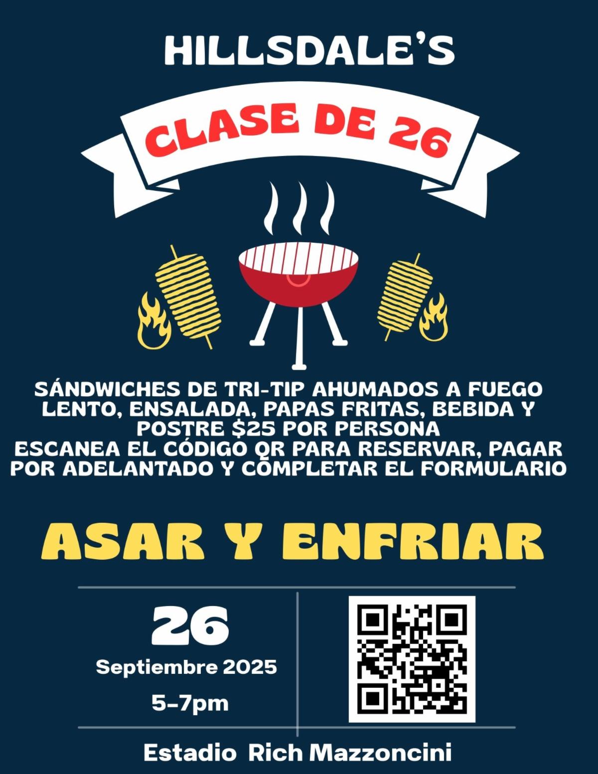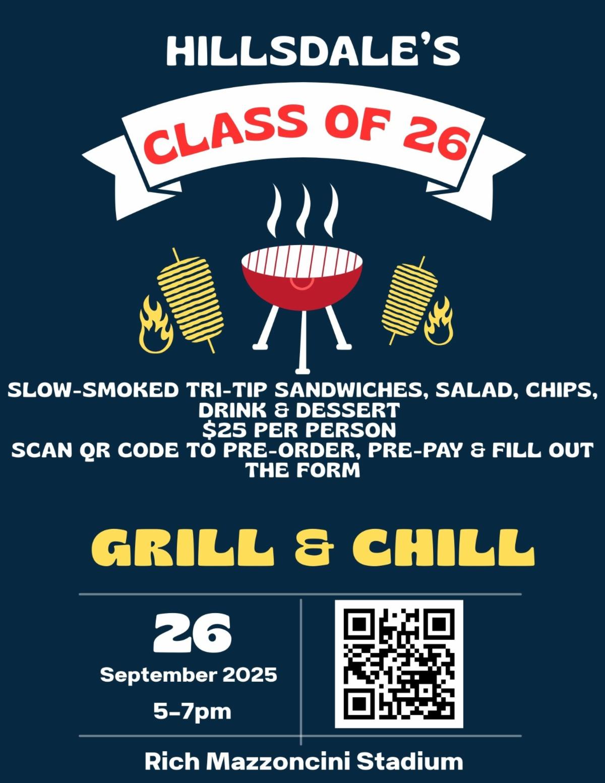 Join us for the Chill & Grill on Friday, September 26th and help support the Class of 2026! 🍔🌭 This fun event is the perfect chance to enjoy a delicious dinner while giving back. Sign up now simply scan the QR code to preorder your meals today.
