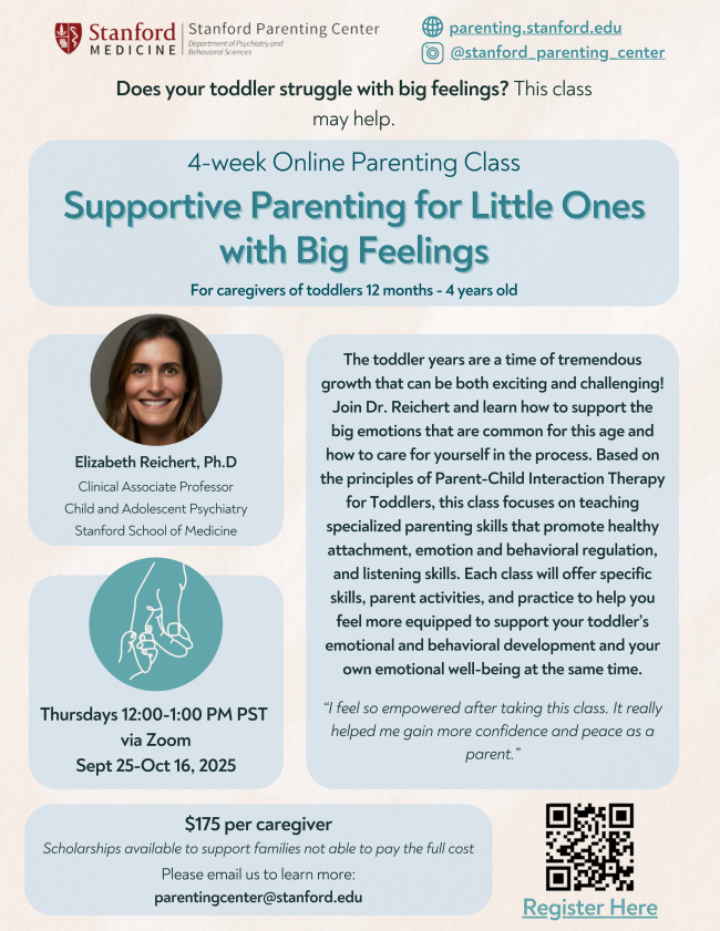 We are currently enrolling for five online parenting classes this fall. These are small, interactive group courses facilitated by Stanford clinicians and faculty:
