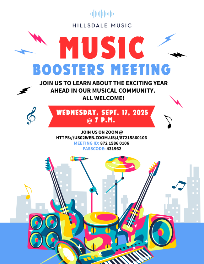 Please join us for our Music Boosters meeting on Wednesday, September 17 @ 7pm on Zoom.