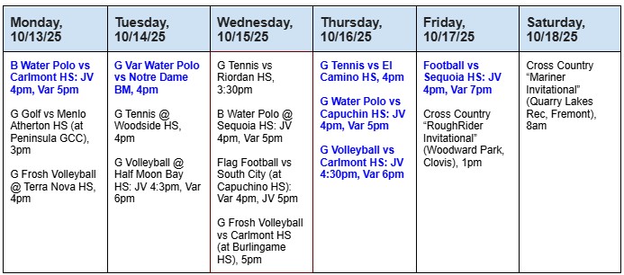 Come support our athletes! Go Knights! (Games in BLUE = home games)