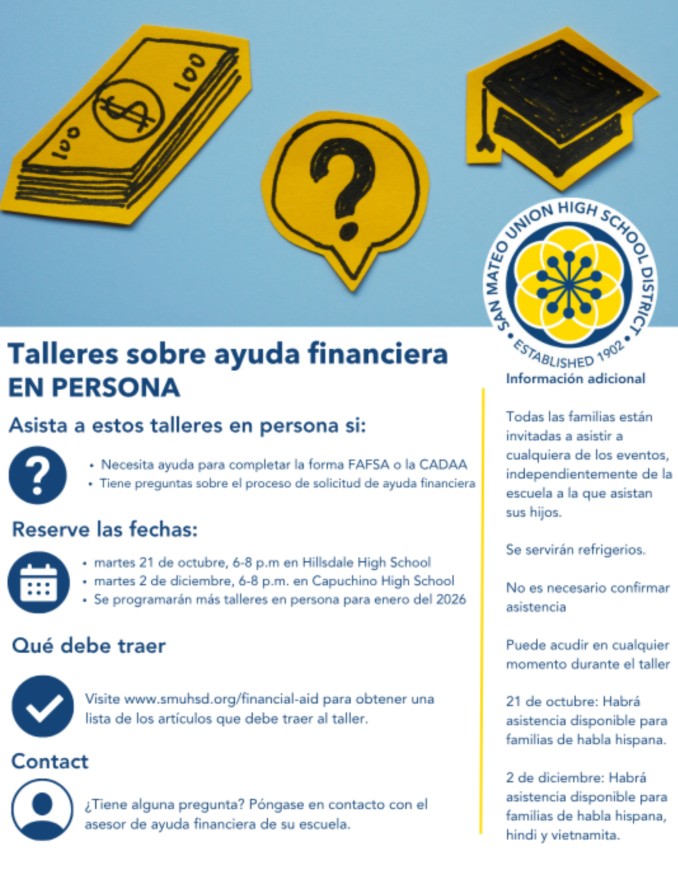 Talleres sobre ayuda financiera en persona. Primer taller el martes 21 de octubre a las 6:00 p.m. en Hillsdale High School