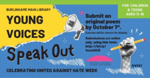Calling all young poets, ages 11- 18 years old: The Burlingame Public Library will be celebrating United Against Hate Week by putting up five poems in front of Burlingame City Hall from October 19-25, 2025.