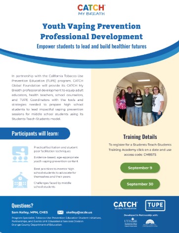 In partnership with the California TUPE program, CATCH Global Foundation (https://catch.org/) is excited to host two upcoming CATCH My Breath Students-Teach-Students Trainings for individuals working with student groups who are interested in participating in the pilot program during the 2025–2026 school year.