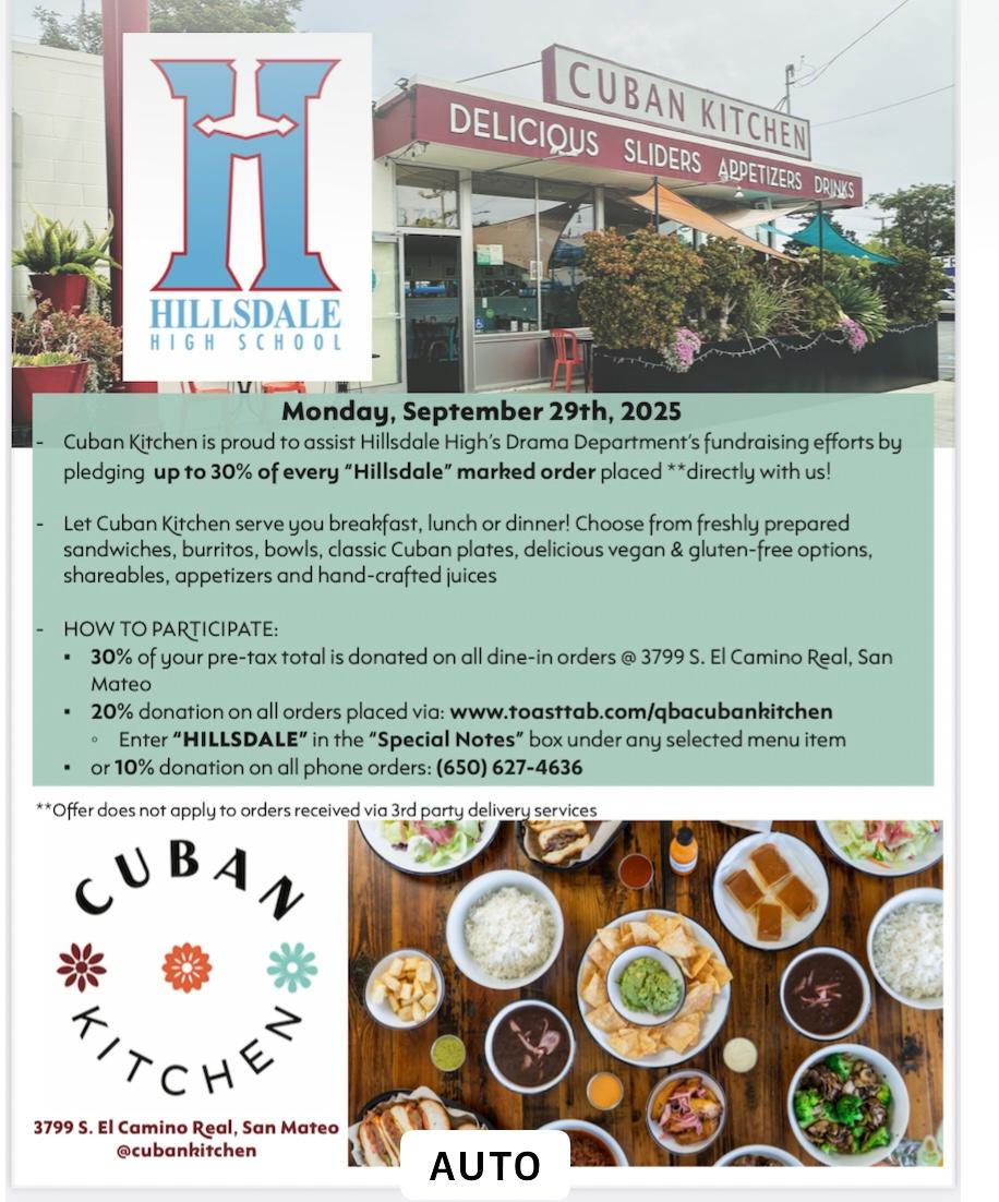 Join Hillsdale Drama Dept. Monday, September 29th, for delicious, healthy, and authentic Cuban food, serving breakfast, lunch and dinner, at Cuban Kitchen, San Mateo 3799 S. El Camino Real. Order in, for takeout, or directly by phone (650) 627-4636 and mention Hillsdale Drama!