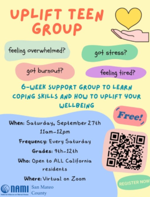 NAMI San Mateo County’s Uplift Teen Group, formerly known as the Blues Teen Group, is starting on Saturday, September 27 from 11 a.m. - 12 p.m. on Zoom.