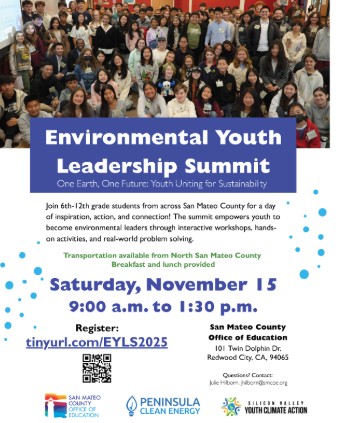 The San Mateo County Office of Education is hosting its Environmental Youth Leadership Summit on Saturday, November 15, 9 a.m. – 1:30 p.m. The summit is organized by students, for students and aims to educate and empower students to take action and be part of creating a sustainable future.