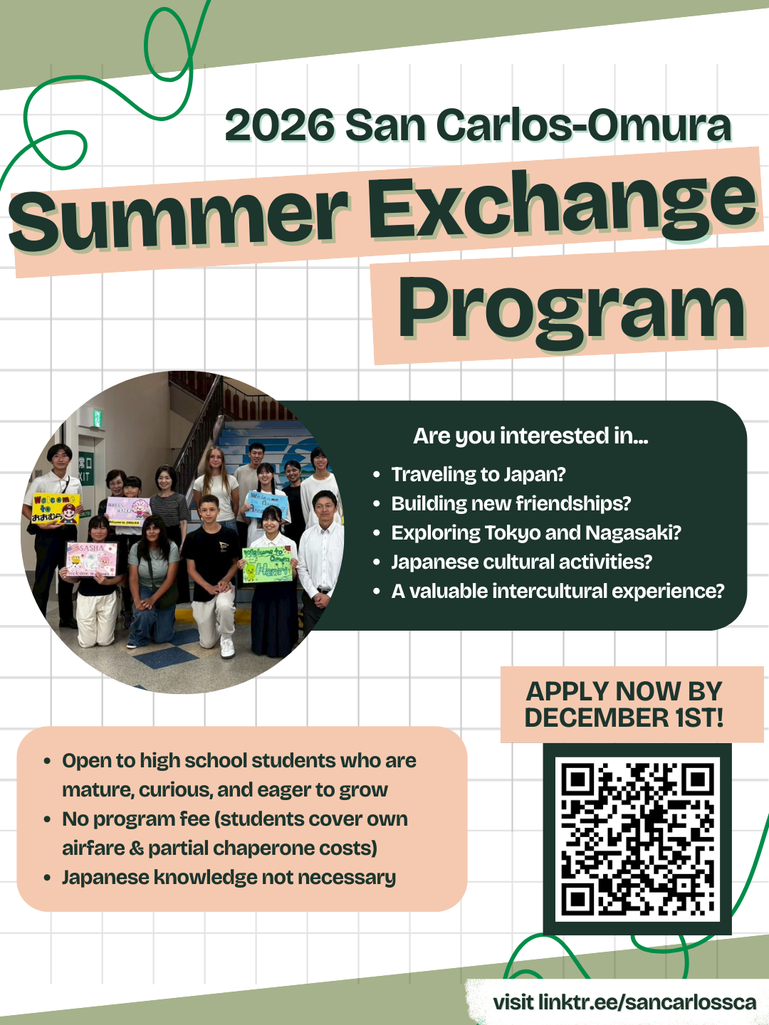 San Carlos Sister City Association (SCSCA) is excited to share an opportunity for high school students in San Mateo County to participate in our International Student Exchange Program with our sister city, Omura, Japan in July 2026. For a week, students will live with a Japanese host family where at least one member speaks English. In exchange, San Mateo/San Carlos students host their Japanese counterparts in the weeks following. Students do not need to know the Japanese language to participate!