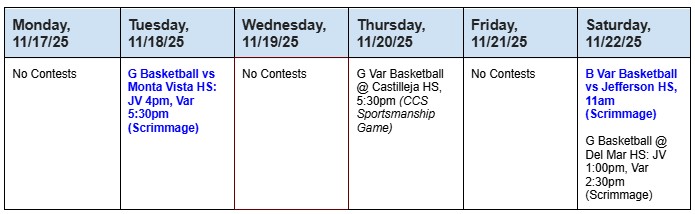 Come support our athletes! Go Knights! (Games in BLUE = home games)