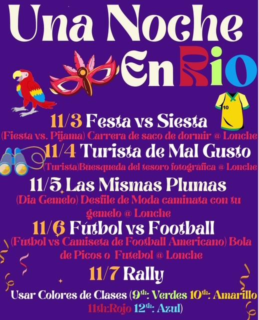 This week is Spirit Week (Flyer) with each day's dress themes relating to our homecoming theme: A Knight in Rio. There will also be daily lunchtime activities and competitions. We will end the week with a rally complete with the class competitions and performances by cheer and dance. They've been rehearsing day and night, so we can't wait to see that hard work pay off!
