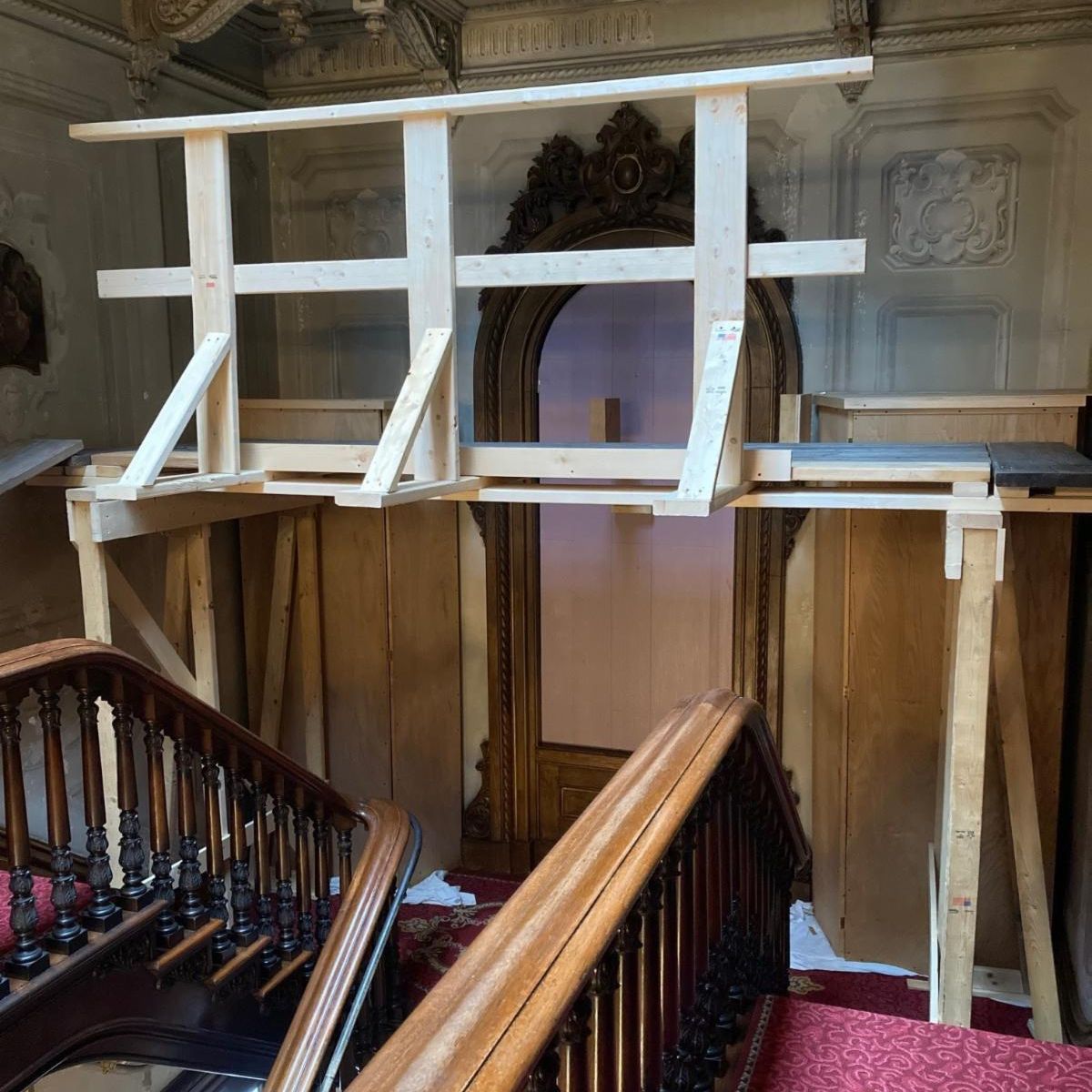 Bob and Sebastian Cariddi install scaffolding on the Stair Hall landing, early February 2024. Wooden boxes have been placed around the sculpted lighting fixtures, and protection has been fitted over the stained glass window. | | |