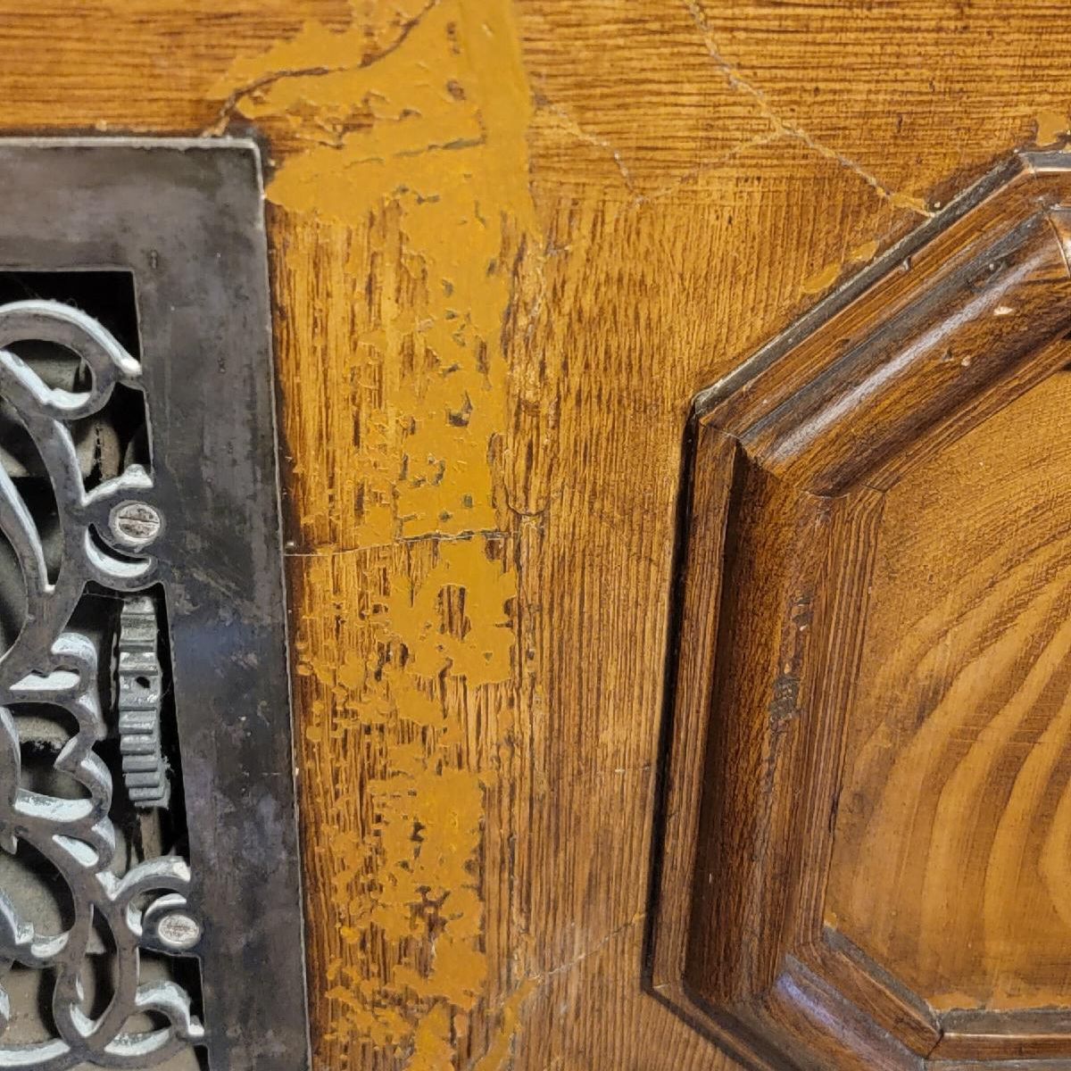 A section of the wainscoting that had lost its graining effect. This "before" image shows the damaged area with a base color in-fill. | | |