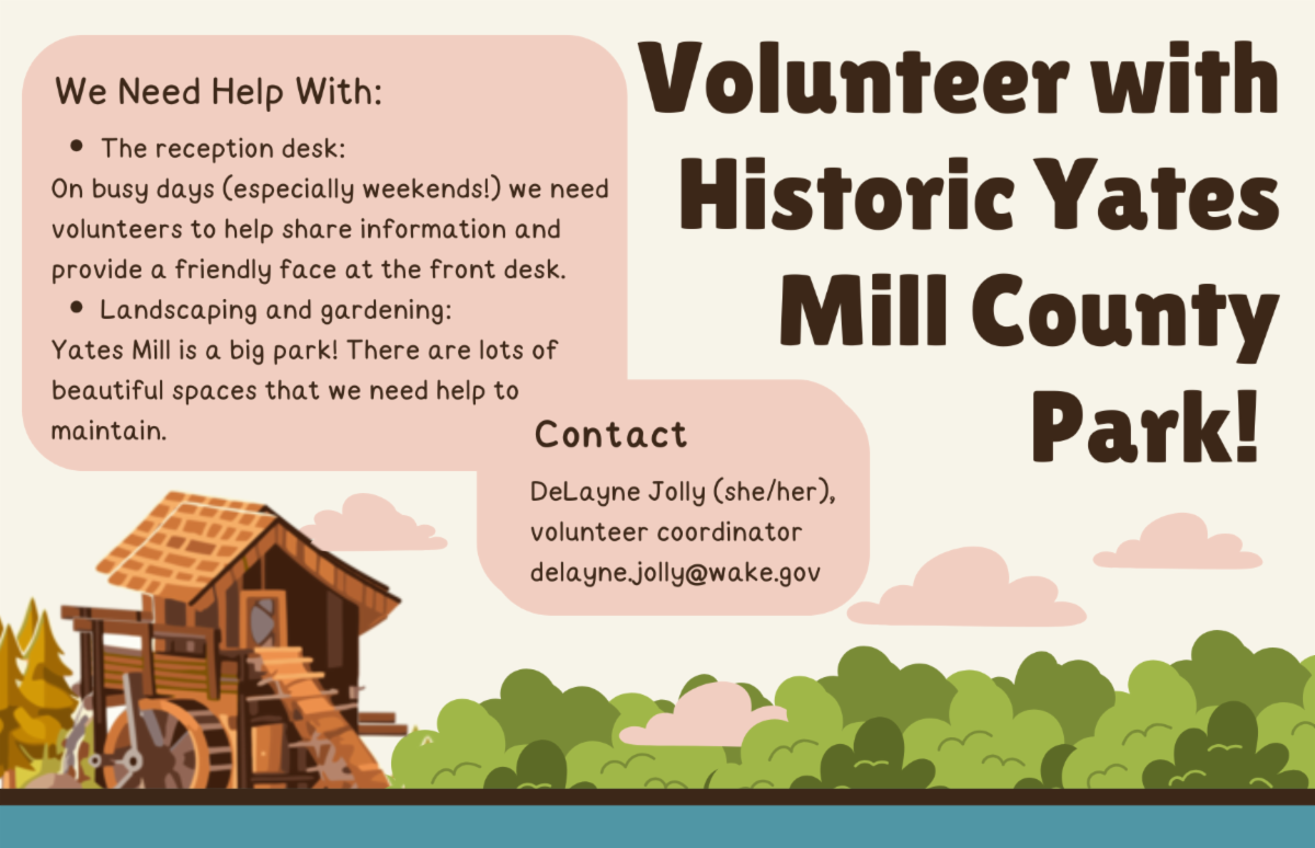 Each park is partnered with a local food pantry to help people here in Wake County. If you’re in a position to help, please bring a nonperishable food item(s) to help feed those in need! Please no glass jars, expired, or opened items. Find more ways to help at: wake.gov/foodsecurity.