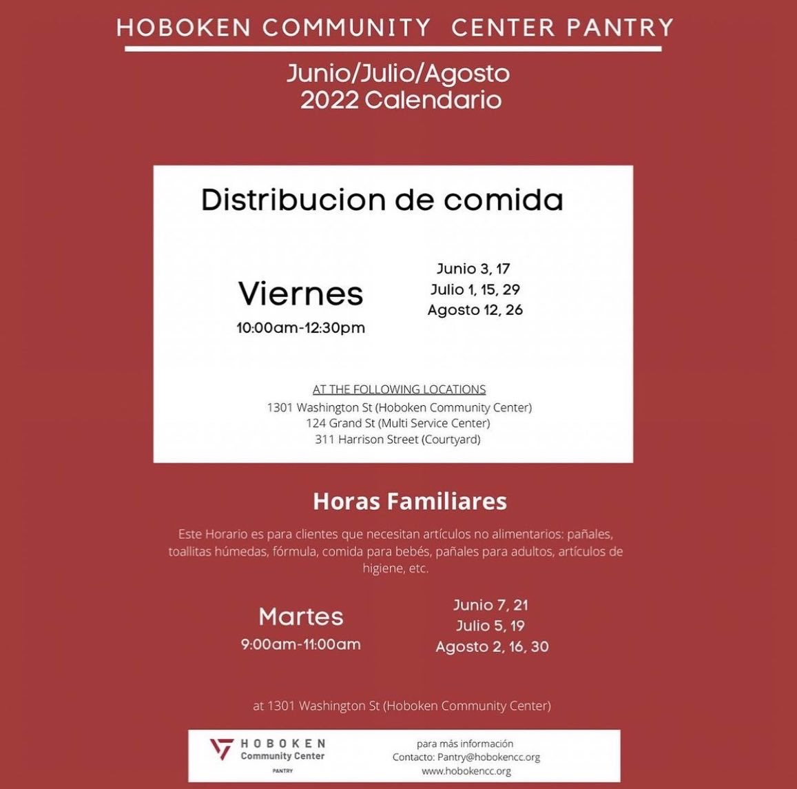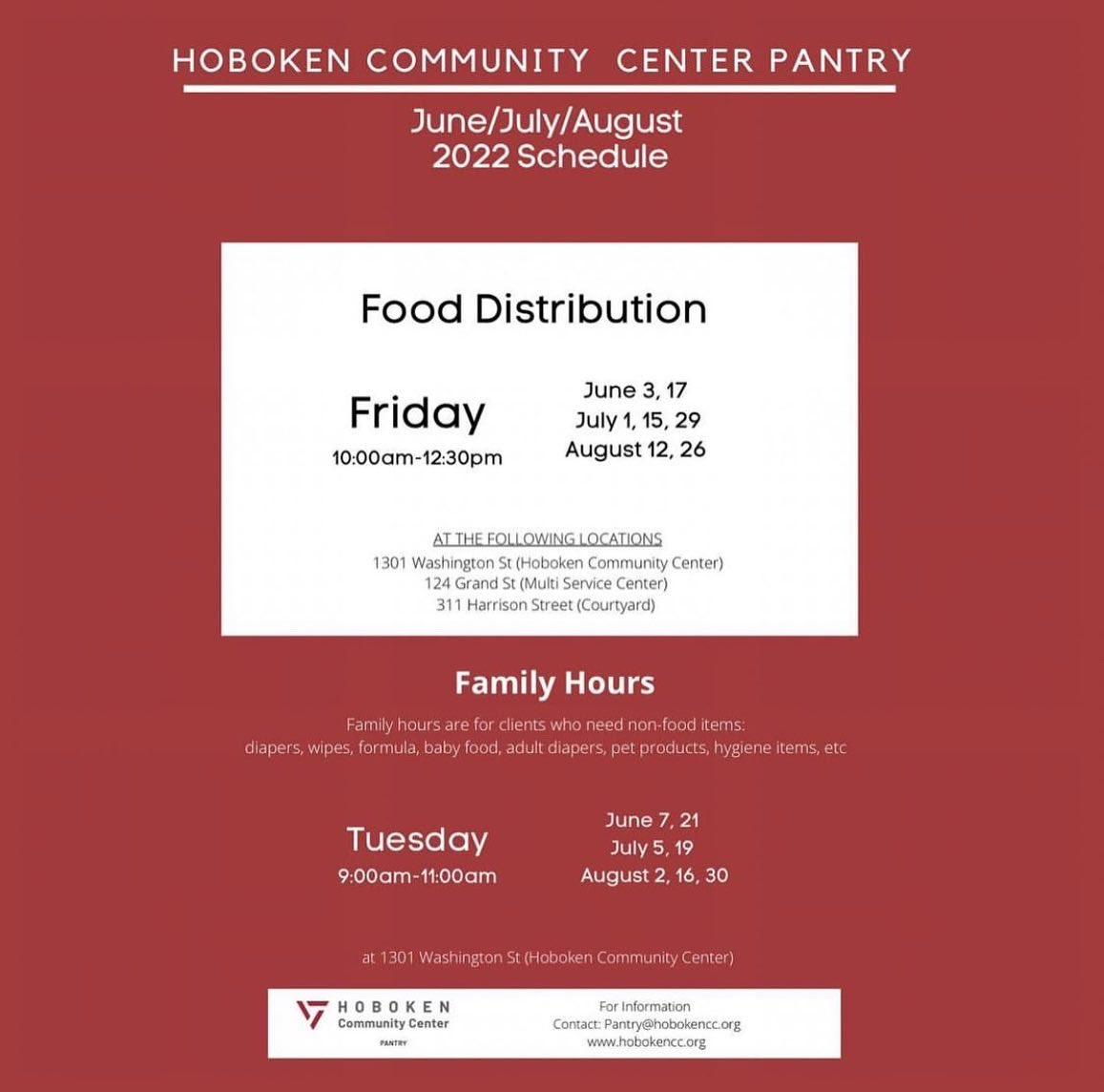 This Friday, July 29 is the next distribution date for the Hoboken Community Center Food Pantry. It will take place from 10am - 12:30pm at 124 Grand St., 311 Harrison St., and 1301 Washington St. For more information contact Pantry@hobokencc.org or visit www.hobokencc.org.