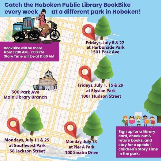 Do you and/or your family enjoy reading books? Check out the Hoboken Public Library’s Book Bike this Friday, July 29 at Elysian Park (1001 Hudson St.). While there you can sign up for a library card, check out & return books, and tune in to a special children’s story time. You won’t want to miss it!