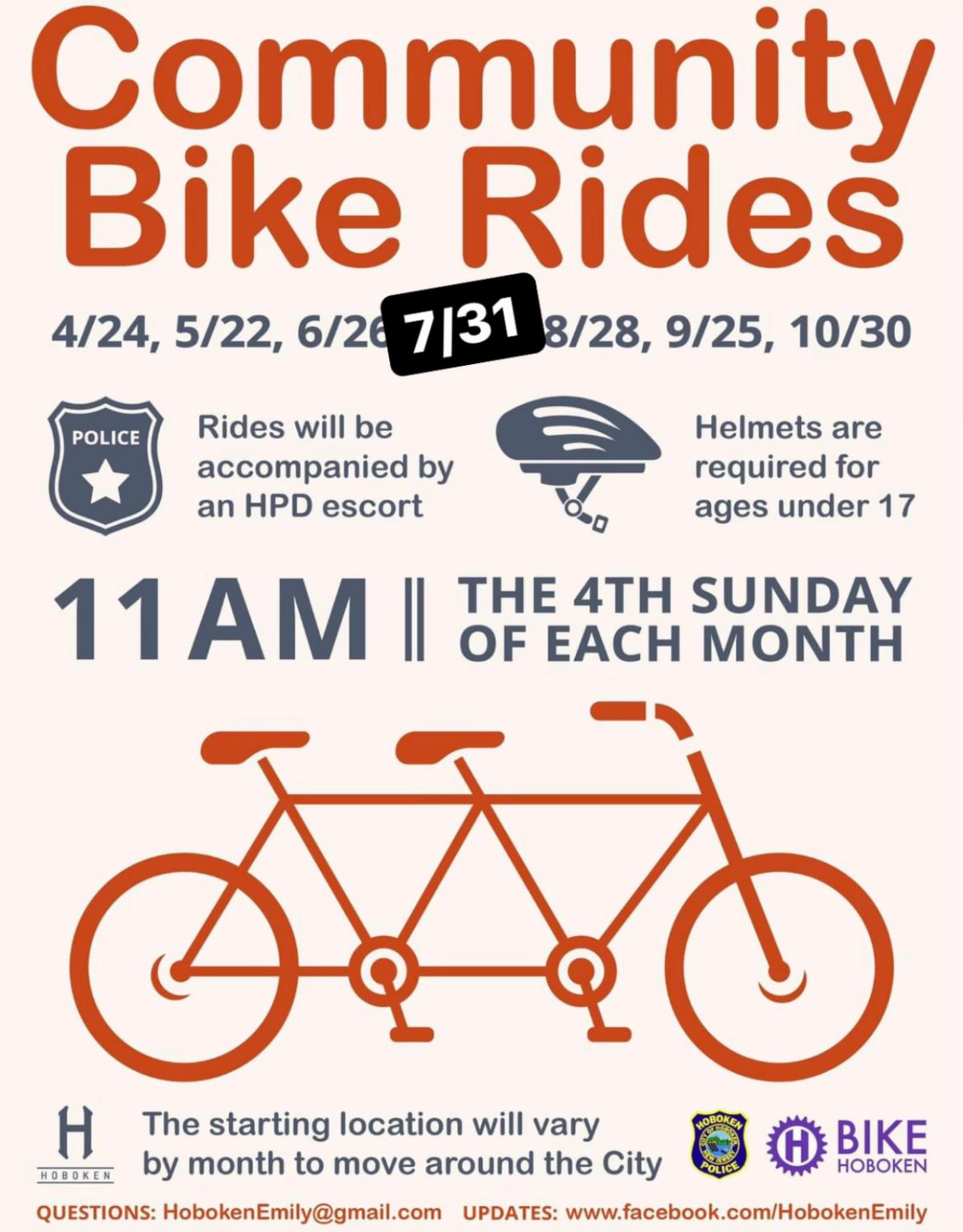 Due to extreme heat, yesterday’s (7/24) Community Bike Ride was rescheduled to this Sunday, July 31 at 11am - meeting at Mama Johnson Field (4th and Jackson). Thanks to Jersey City Medical Center, free kids bike helmets will also be provided. Helmets are required for individuals under the age 17 during the ride, which is approximately 4 miles and takes about one hour.