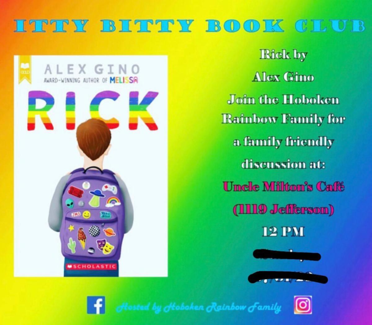 Join the Hoboken Rainbow Family for their next meeting of the Itty Bitty Book Club. This week they will be discussing the book, Rick, by award-winning author, Alex Gino, at Uncle Milton’s Café (1119 Jefferson St.) this Saturday, July 30 at 12pm!