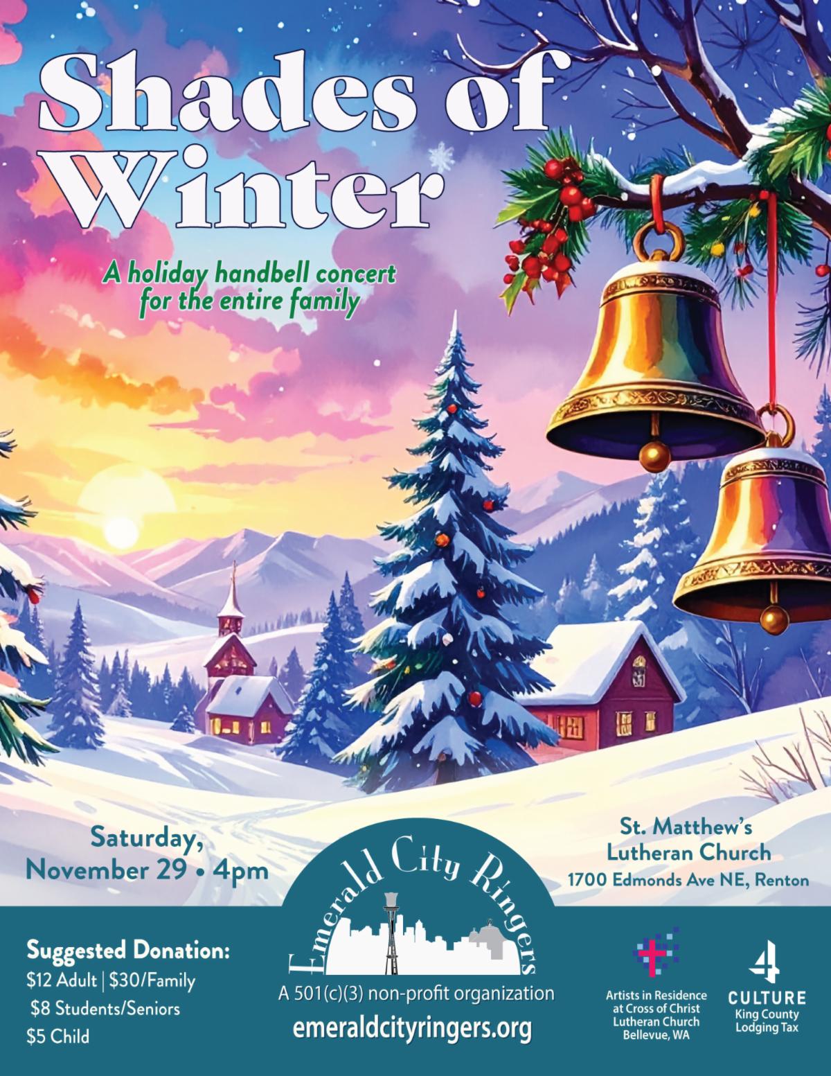 | | | | Emerald City Ringers will present our winter concert, “Shades of Winter”, on Saturday November 29 (the Saturday of Thanksgiving weekend) at 4 pm at St. Matthew’s Lutheran Church in Renton, WA. The concert will feature popular holiday tunes played in ECR’s unique double-choir format. St. Matthew’s is located at 1700 Edmonds Ave NE, Renton, WA 98056. We hope to see you there! | | | |