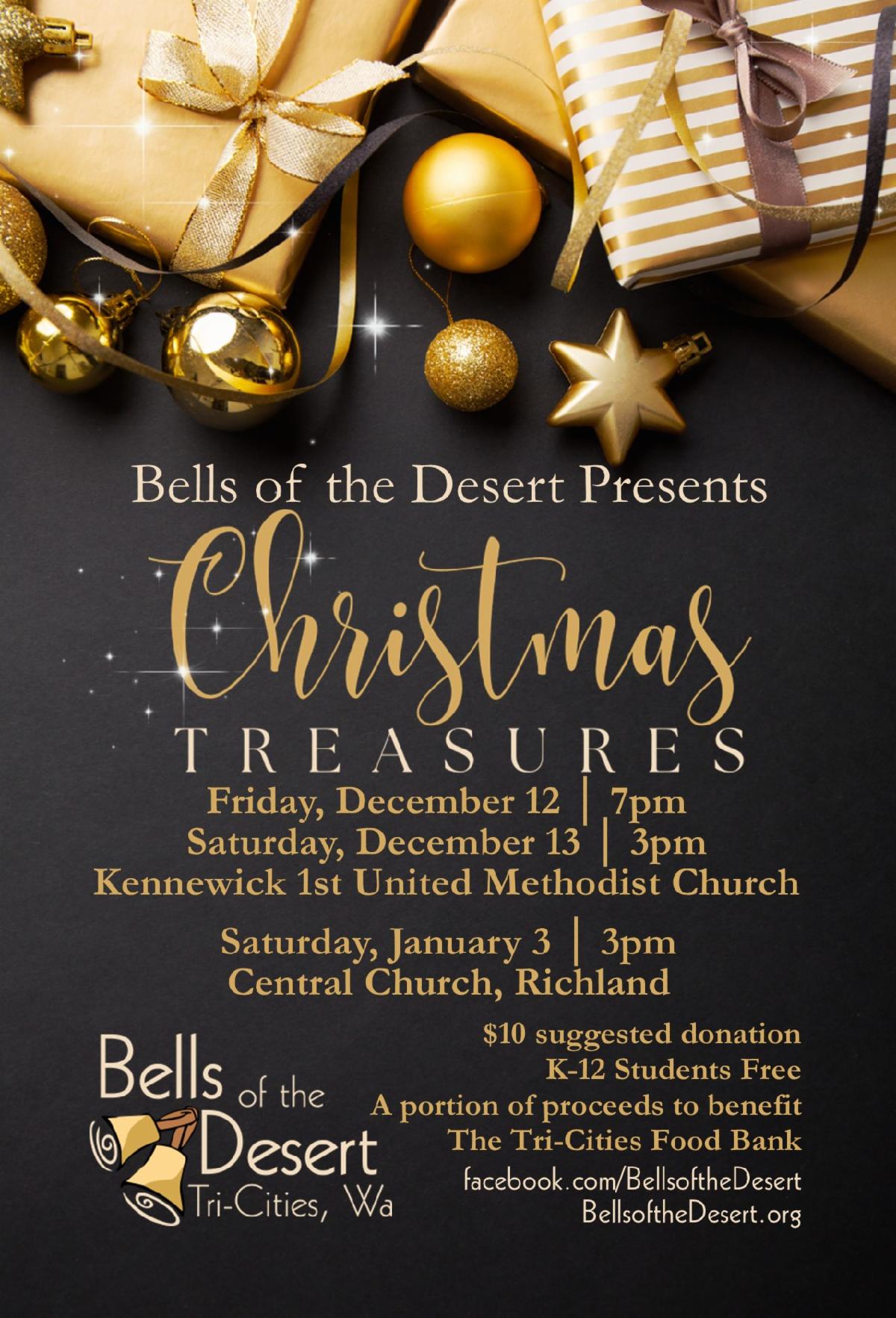 | | | | We hope you will mark your calendars and save the date for our upcoming Christmas Concerts! Bells of the Desert will present "Christmas Treasures" in three performances this December and January. We will be presenting a selection of our favorite holiday tunes, from traditional carols to newer radio hits. There's sure to be something to get your toes tapping! This season, Bells of the Desert is playing in support of the Tri-Cities Food Bank. We will donate half our net proceeds from these performances to the food bank and also run a food drive. Please consider bringing a donation of non-perishable food to support this important organization and make the holidays a little brighter in our community. | |