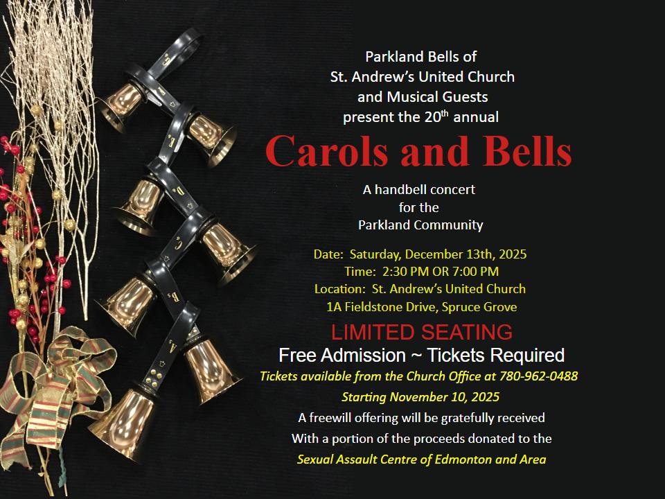 Parkland Bells of St. Andrew’s United Church in Spruce Grove, Alberta, Canada is celebrating 20 years of offering public concerts to the community. Over the years, our handbell music ministry has grown from a single choir ringing two octaves of bells to two choirs ringing five octaves of bells and handchimes and, following the pandemic, back to a single choir five octave choir. Through it all we have welcomed a growing following of repeat guests for whom we are truly thankful. Our concert this year will include Christmas carols shared by our full choir, our quartet, a handbell solo and a bell tree solo. To add variety, our concert will also include vocalists, a pianist, a harpist and a clarinet duet. We’ll wrap up with an audience participation song wishing everyone a Merry Christmas! A freewill offering will be received and, as has been our tradition, a portion of the proceeds will be donated to a charity. This year, the charity chosen is the Sexual Assault Centre of Edmonton and Area. We hope you will join us and ring in your Christmas season!