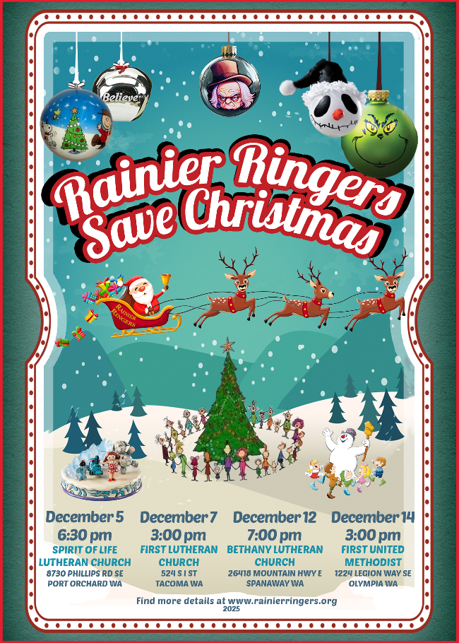 It never seems to fail. There always seems to be some Grinch in our life, some snow miser stealing our fun, some Scrooge missing the point of the season. But never fear Rainier Ringers are here. We have wizard's magic to help you find the internal good, the inner child and the Heart of Christmas. Join the Rainier Ringers this season to remember the eternal joy of the season!