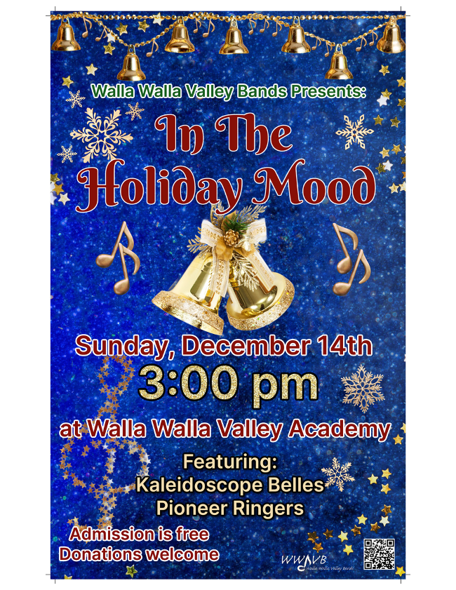 The Walla Walla Valley Bands has invited a local handbell choir, Pioneer Ringers and the handbell duo, Kaleidoscope Belles, to join them for their holiday concert centered around the theme of Christmas bells.