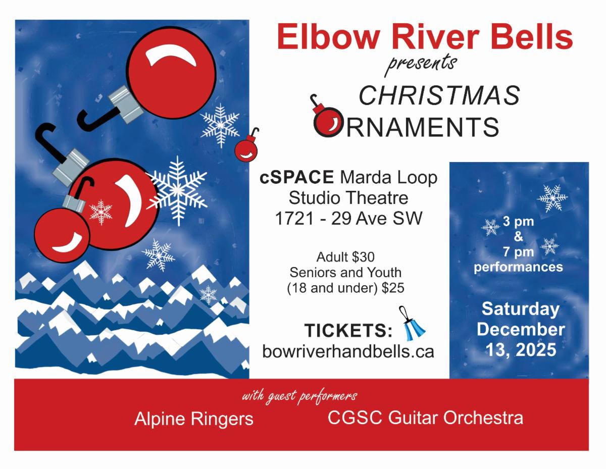 | | Elbow River Bells is a 10 person small ensemble who performs weekly throughout the year- and will share the best of their Christmas program. Alpine Ringers is one of Bow River Handbell Musicians Society's (BRHMS) advanced teams who is challenging new expressions in ringing- using choreo and memory work to create something new for our audience. Calgary's fine Guitar Orchestra will be performing as well. | | |