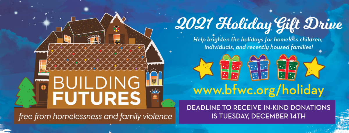 Every year, caring community members donate pajamas, toys and gifts for the children and individuals Building Futures serves. This year because of the pandemic, we are asking our community to give physical gift cards or make a monetary donation. Building Figures will take care of the shopping and wrapping!