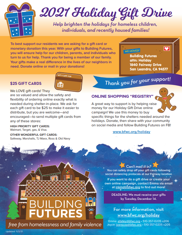 You may donate online or mail your gift/s to 1840 Fairway Dr., San Leandro, CA 94577. Our strongest gift card need is for gift cards in $25 increments, from Walmart, Target, and Safeway.
