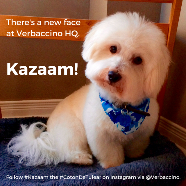 Kazaam is happily assisting at Verbaccino Headquarters in the role of Mascot & CFO (Chief Fitness Officer, in charge of daily walkies).