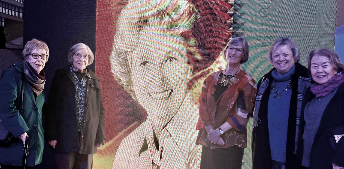 Standing with an illuminated photo of Mayor Hayes at the event are (left to right) Martha Beattie, Virginiz Holtz, Megan Hayes, youngest daughter of Janet Gray Hayes, Rosaleen Zisch and Gloria Chun Hoo.